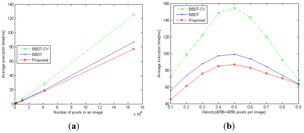 Execution time (ms) versus (a) the number of pixels in an image, and (b) the density of 4096 × 4096 pixel images.