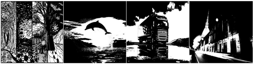 Our evaluations focused on the labeling speed of the proposed algorithm, BBDT, and FCC using a real image dataset. The three algorithms were tested in two experiments. In the first experiment, images were taken from the “GdeFon” (GF) datasets [29]. Sixty images were selected and resized to 6000 × 6000, 7000 × 7000, 8000 × 8000, 9000 × 9000, 10,000 × 10,000, 11,000 × 11,000, and 12,000 × 12,000 pixels per image. The downloaded images were taken from diverse categories such as “abstraction,” “animal,” “auto,” “city,” “holiday,” “landscapes,” “space,” and “stuff” to provide a large number of provisional labels, as shown in Figure 9. All images were transformed into grayscale by Otsu’s method [30] prior to the experiments.