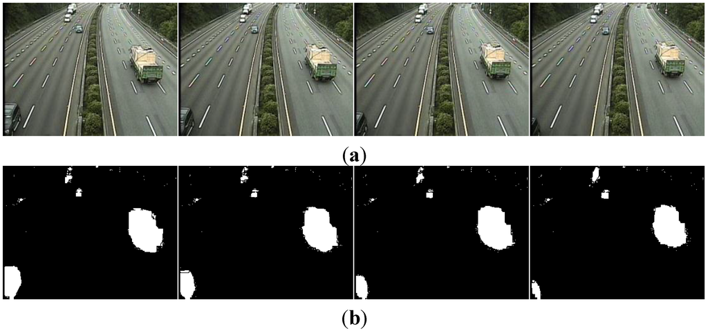 The second experiment used 382 sequential images of real driving scenarios containing various sizes and types of vehicles from a dataset that we call “Formosa Highway” (FH) in this paper. The FH image dataset [31] was captured using a camera on the Formosa Highway in Taiwan. The FH image dataset shows a surveillance perspective of parts of the highway. The sequential images of the FH dataset have a size of 320 × 240 pixels each. Prior to applying the labeling algorithms, the images were pre-processed according to the background subtraction method in [32] to generate foreground pictures. Eight sample images from the FH dataset are shown in Figure 10.