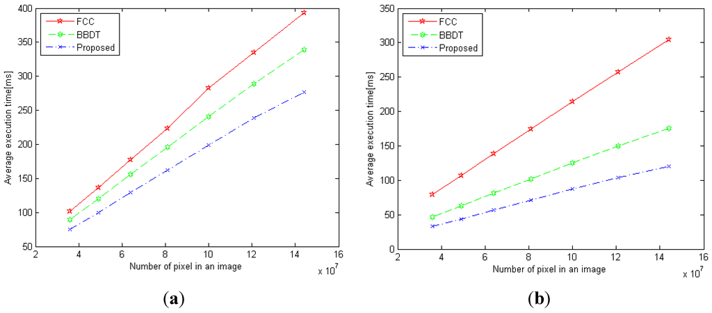 The GF dataset was used to test the average execution time of each algorithm against the number of pixels in each image. The average time required by each of the three labeling algorithms, as well as that of their first-scan methods, is shown in Figure 11. The results show that the average execution time for all three algorithms exhibited linear characteristics. The proposed algorithm outperformed the other two labeling algorithms for all image sizes. For images of size 12,000 × 12,000 pixels, the execution times of our proposed algorithm, BBDT, and FCC were 276.72 ms, 338.83 ms, and 392.93 ms, respectively, as shown in Figure 11a. Thus, our algorithm was 18.33% and 29.57% faster than the BBDT and FCC algorithms, respectively. With regard to the first-scan method, the proposed algorithm, BBDT, and FCC recorded average execution times of 120.66 ms, 175.92 ms, and 304.44 ms, respectively, to complete the labeling task, as shown in Figure 11b. The proposed algorithm thus required 31.41% and 60.36% less time than the BBDT and FCC algorithms, respectively. According to the experimental results for the GF dataset, the proposed algorithm is the most efficient of the three labeling algorithms tested.