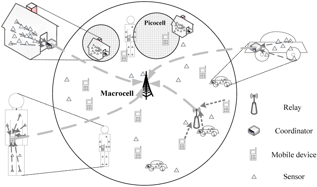 In the meantime, the Internet of Things (IoT) is also developing rapidly. Applications, such as smart city [], Internet of vehicles [], body area network (BAN) [] and Internet of bio-nano things [], were extensively studied, making IoT the most promising concept to integrate the Internet with various domains [], such as industry, agriculture, healthcare, transportation, markets, education, smart homes, etc. Dense deployment will be a new and key feature for future wireless communication systems []. Recent studies revealed that IoT and HCNs should integrate to form a new wireless network paradigm for providing real-time and always best connected (ABC) services to both sensor and mobile devices [,]. In this network paradigm, mobile devices are able to directly connect to any cell base station (BS) covering it or indirectly connect to a certain BS through a relay. Similarly, sensor devices could also directly transfer data to a BS in the flat networking architecture or indirectly transfer data through a coordinator or relay, such as a mobile device. Figure 1 provides a vision of this network paradigm integrating IoT and HCNs.
