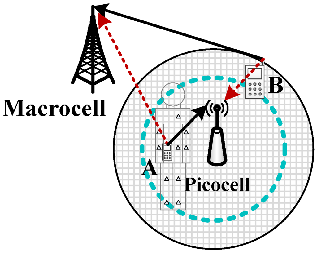 After the development of the first four generations, mobile communication systems are encountering new bottlenecks and challenges. On the one hand, many previous hot techniques, such as carrier aggregation, multi-antenna and coordinated multi-point, have been approaching their upper bounds for improving the link-level spectral efficiency [,,]. On the other hand, existing network facilities for mobile communications are constructed outdoors, but in-building-generated phone calls and data traffic are expected to account for more than half of the total volume in the near future [,]. To evolve mobile communication systems toward 5G, a new network paradigm has been raised, called heterogeneous cellular networks (HCNs), which is composed of various types of cells deployed complementarily, forming a heterogeneous environment for wireless devices to access [,,]. In HCNs, besides macrocells and microcells covering large-scope areas, picocells and femtocells are deployed to cover hotspots and blind zones, so that seamless and ubiquitous access service can be provided at any time anywhere.