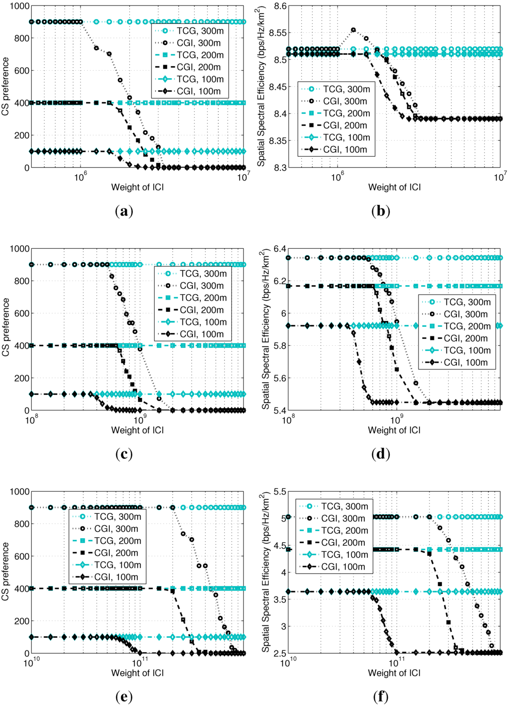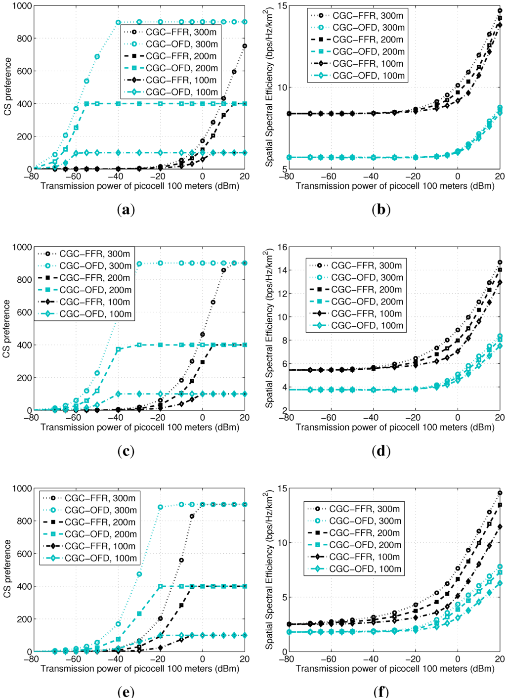 Impact of ICI on CS preference and spatial spectral efficiency using CGC-fractional frequency reuse (FFR) and CGC-orthogonal frequency division (OFD). (a) Path Loss 2 (free space); (b) Path Loss 2 (free space); (c) Path Loss 3 (suburbs); (d) Path Loss 3 (suburbs); (e) Path Loss 4 (downtown); (f) Path Loss 4 (downtown).