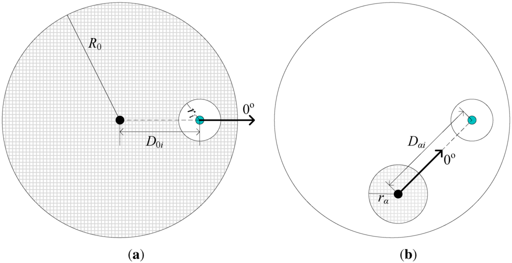 The polar coordinate systems for calculating the ICI. (a) To calculate x; (b) to calculate y.