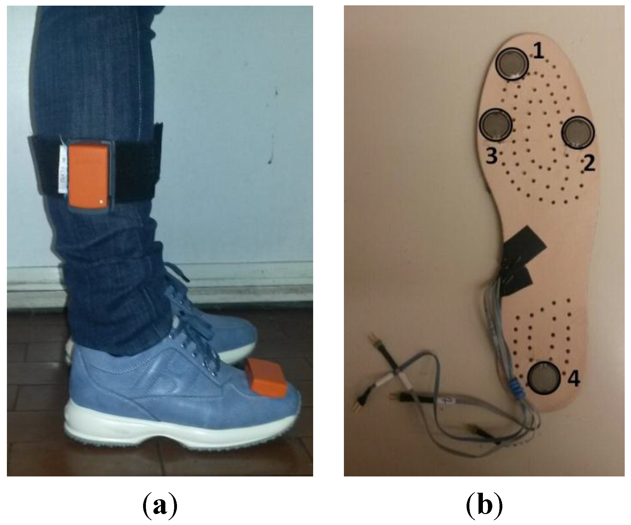 Sensor positioning on the subject. (a) Position of IMUs on participants’ lower limb; (b) position of foot-switches under participant’s instrumented foot (1: toe, 2: fifth metatarsophalangeal, 3: first metatarsophalangeal and 4: heel).