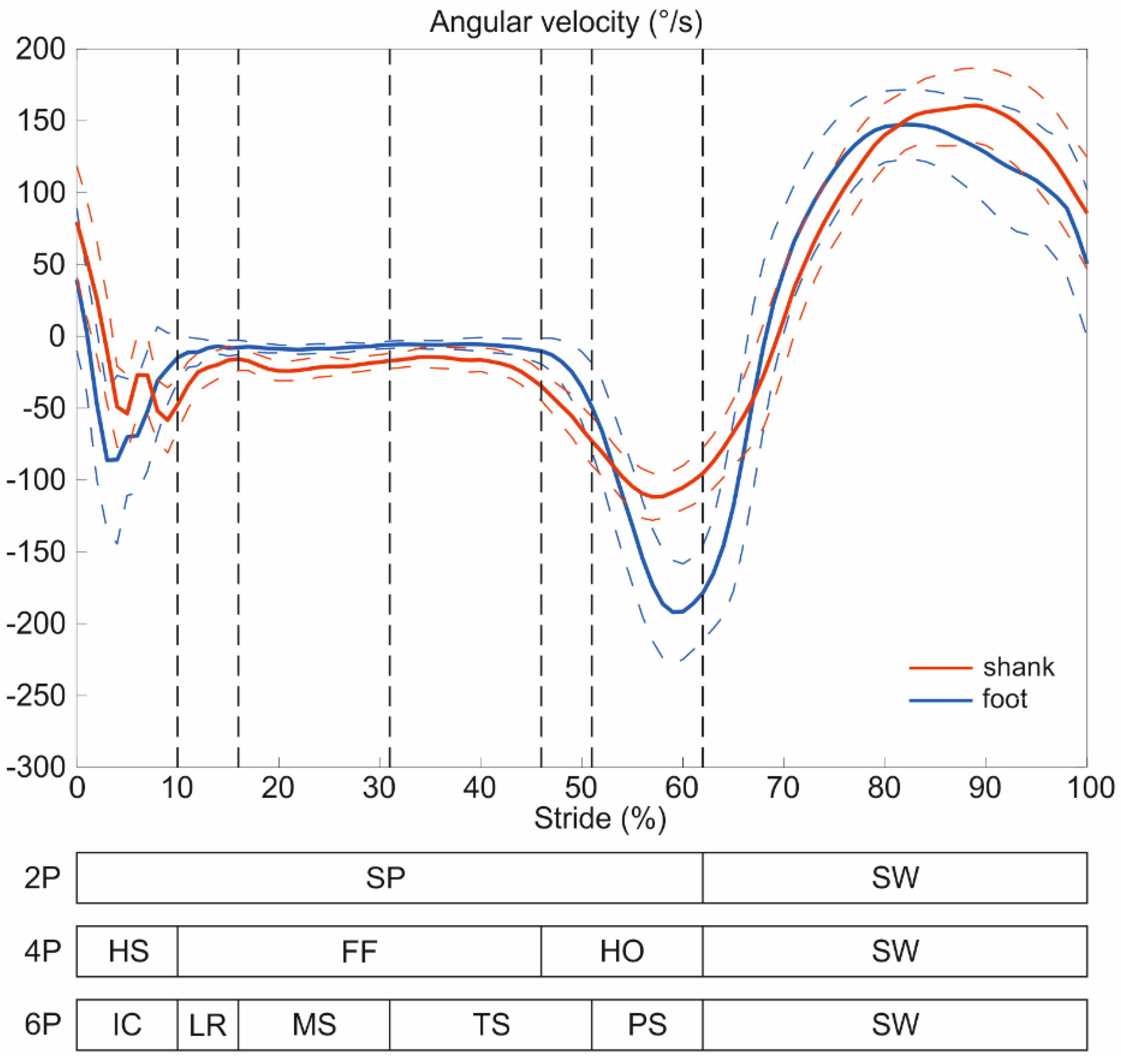 σ of Equation (1). An example of angular velocity signals of shank and foot divided into two, four and six gait phases, relative to healthy children, is reported in