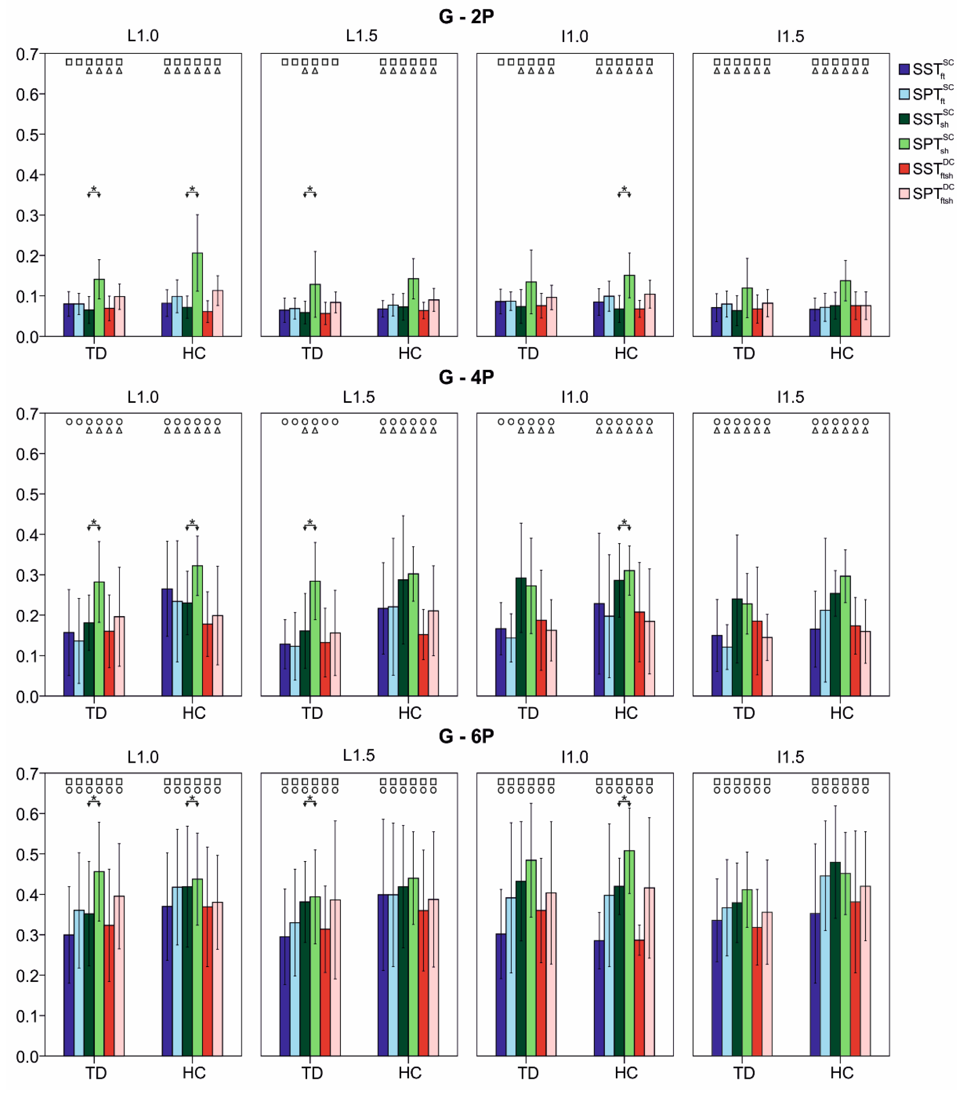 Goodness (G) mean values and standard deviations (error bars) for typically developed children (TD) and children with hemiplegia (HC) in the four walking conditions (L1.0, L1.5, I1.0, I1.5) computed with scalar and distributed classifiers and with the two training procedures (SST and SPT). Statistical difference between: (i) the SST and SPT procedures are marked with *; (ii) two-phase model (2P) and four-phase model (4P) with a triangle; (iii) 2P and six-phase model (6P) with a square and; (iv) 4P and 6P with a circle.