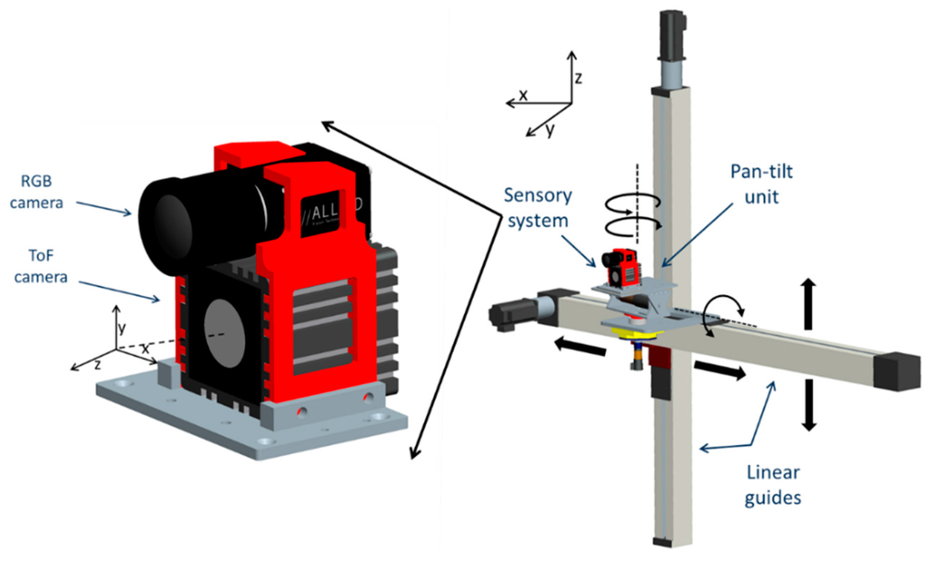 Sensory system configuration. The sensory rig consists of a ToF camera and a RGB camera, and it is mounted on a robotic platform with four degrees of freedom.