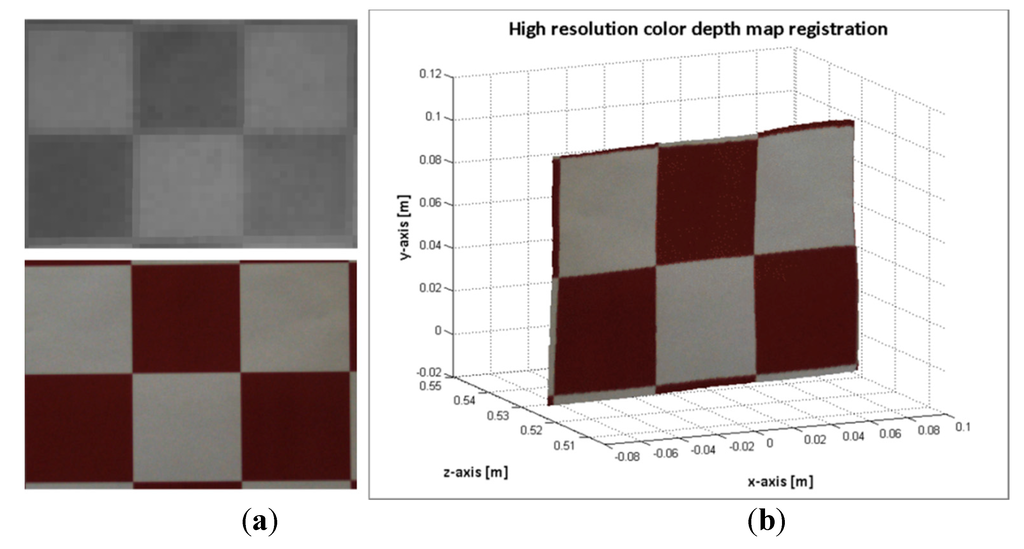 In order to compare the results of the standard calibration method with the results of the depth-dependent Hlut method for the depth map registration, the real raw depth measurements of the pattern board of the 62 image samples were used. The data fusion by means of the standard calibration technique was carried out by implementing the method described in [14], were the depth measurements are used to back-project the 3D world points to the 2D points on the RGB image. In the case of the depth-dependent Hlut approach, the depth map registration was done by following the procedure described in Algorithm 2 (see Section 2.3).