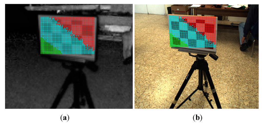 In order to evaluate the registration method proposed in this work, two series of experimental tests were conducted. The first group was focused on registering planar object from different perspectives with respect to the sensory system. Thus this means an angled continuous planar surface might be transformed by several homographies . This was achieved by modifying the perspective view of the white-red pattern board. The experimentation setup consisted of the four degrees of freedom robotic platform, the 3 × 5 white-red chessboards of 50 mm each square and the sensory system. The sensory system was mounted on the robotic platform (see Section 2.1 for the platform description). The pattern board was positioned in front of the cameras and the inner grid was aligned with the centre of the ToF camera. Then, 25 images from different poses of the sensory rig were acquired. Additionally, another 37 images of the pattern at different positions and distances were also captured. The results of the registration procedure of two image samples are illustrated in Figure 11 and Figure 12. The transformation matrices applied for transferring the points are represented with coloured marks; each colour represents an entry k of each homography.