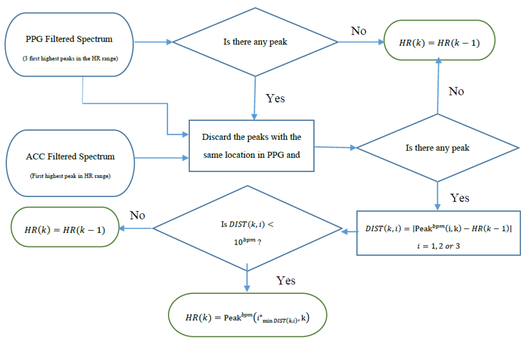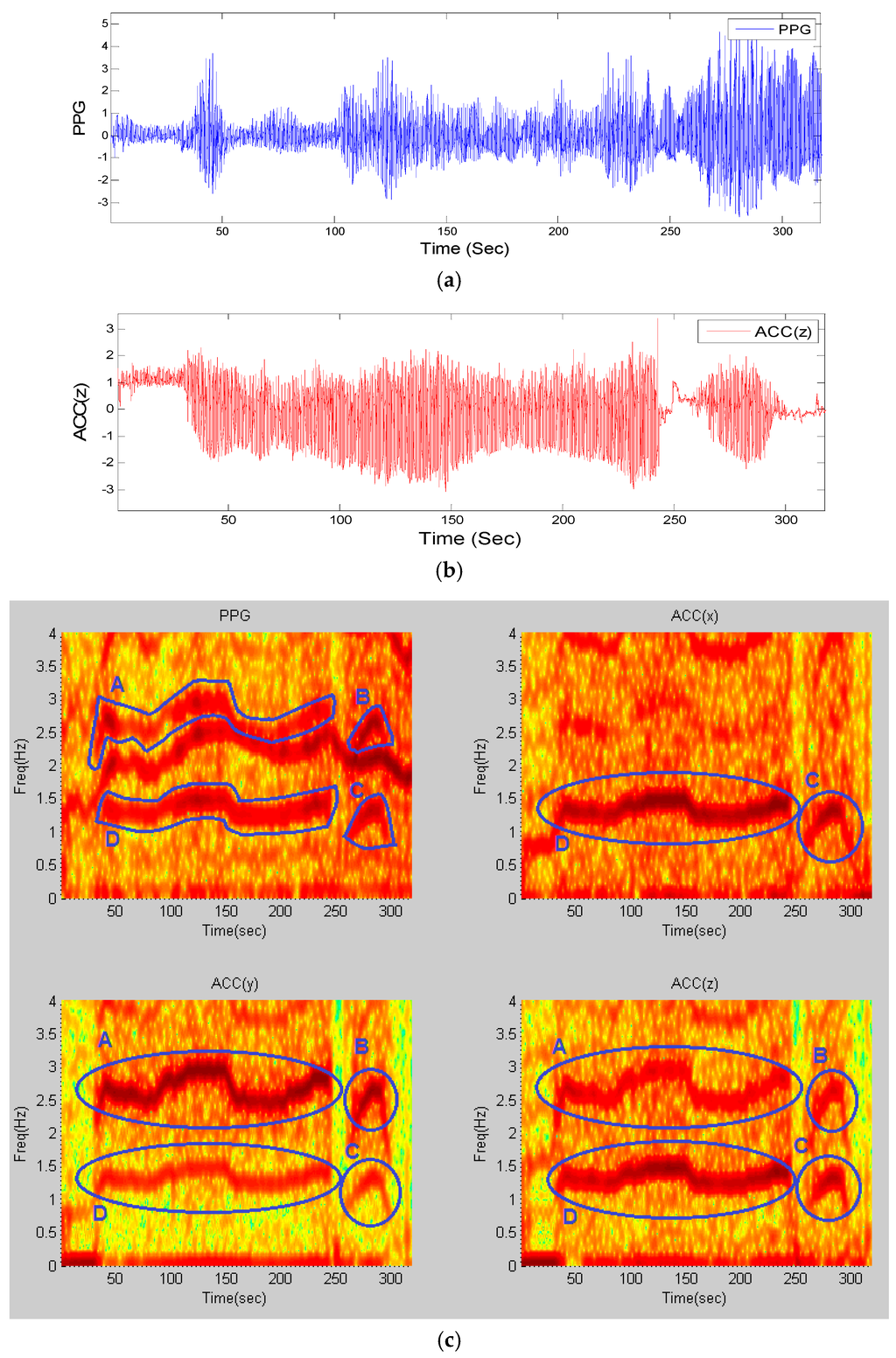 24] suggested a spectral subtraction technique to remove the spectrum of acceleration data from that of a PPG signal. Acceleration data can be also used to reconstruct the observation model for Kalman filtering [