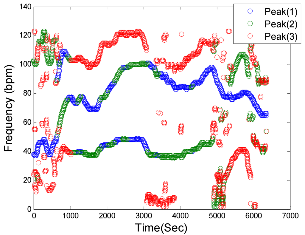 We made several observations while analyzing the data. The tracking ability of the SpaMA algorithm decreased as the frequency changes during recordings increased. This phenomenon mostly was observed while dealing with the second set of datasets from the IEEE competition, which involved Type (2) and Type (3) activities. These types of exercises involved more abrupt movements which consequently made it more difficult to track the HR-related frequencies in the spectrum. In the three datasets that have been analyzed, recordings #10 and 14 are examples of this phenomenon.