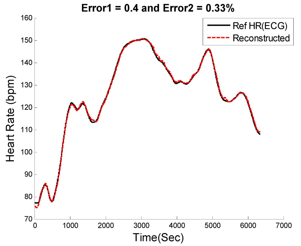 Figure 8. We can see that the E1 for this particular subject is as low as 0.4 bpm and the correlation between the PSD of reconstructed HR and reference HR is as high as 96%.