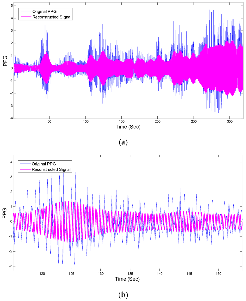 Figure 9a illustrates the comparison between the reconstructed HR and the reference HR for subject #14 which has the highest errors. Subject #14 belongs to the second dataset (IEEE Competition Test dataset) and Type 2 activities (e.g., jumping). It can be seen that the largest error is obtained when both the physiological HR and the motion artifacts change rapidly so that the true HR cannot be reliably estimated.