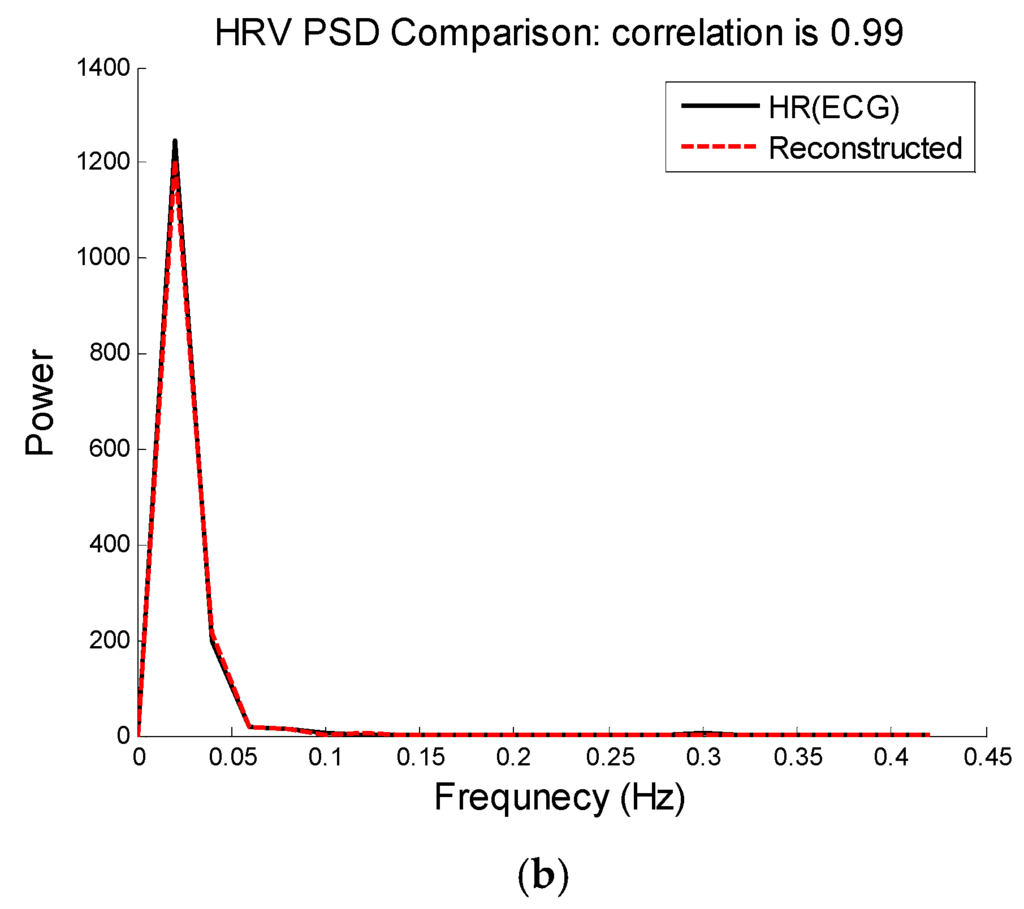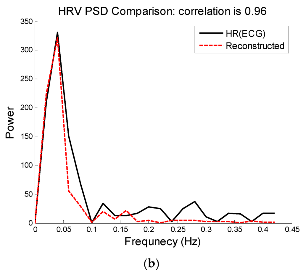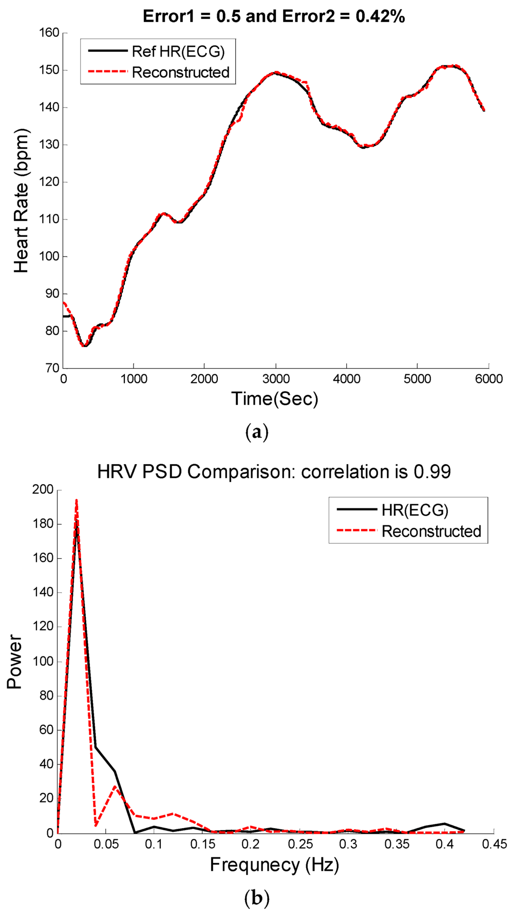 Figure 10. It can be seen that the E1 for this subject is around 0.6 bpm and the correlation between the PSD of reconstructed HR and reference HR is as high as 99% for LF and 0.96 for HF frequency range. All subjects’ results are provided in