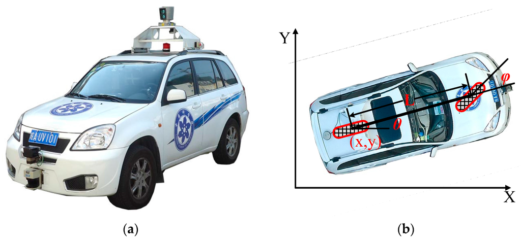 The autonomous vehicle prototype “Intelligent Pioneer II”, as shown in Figure 1a, is developed for the Intelligent Vehicle Future Challenge Competition in China. Based on the assumption that the wheels are rolling without slipping and the steering angle is simplified as a single wheel in the midpoint of the two frond wheels [33], the vehicle kinematic model can be described as the bicycle model (see Figure 1b). The kinematic model of the driving vehicle is written as: