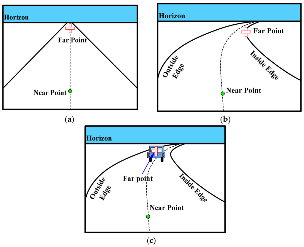 For clarity, the definitions of the near and far points are provided at first. The near point is described as a point in the center of the near lane in front of the vehicle, set at a distance of 10 m from the vehicle’s center, whereas the far point is described as one of three objects: (a) the distant point of a straight roadway according to the vehicle’s speed (see Equation (7)); (b) the tangent point of a curved road; and (c) a lead vehicle, that is, the vehicle in front of the autonomous vehicle [26].
