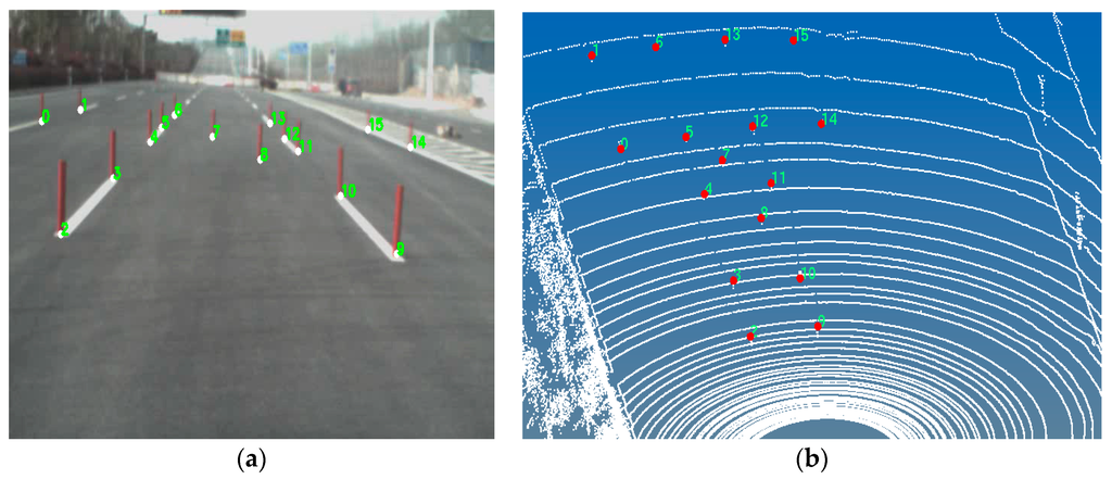 Mapping illustration of between the image data and the laser radar data. (a) Image points in the camera coordinate and (b) corresponding position points in the world coordinate.