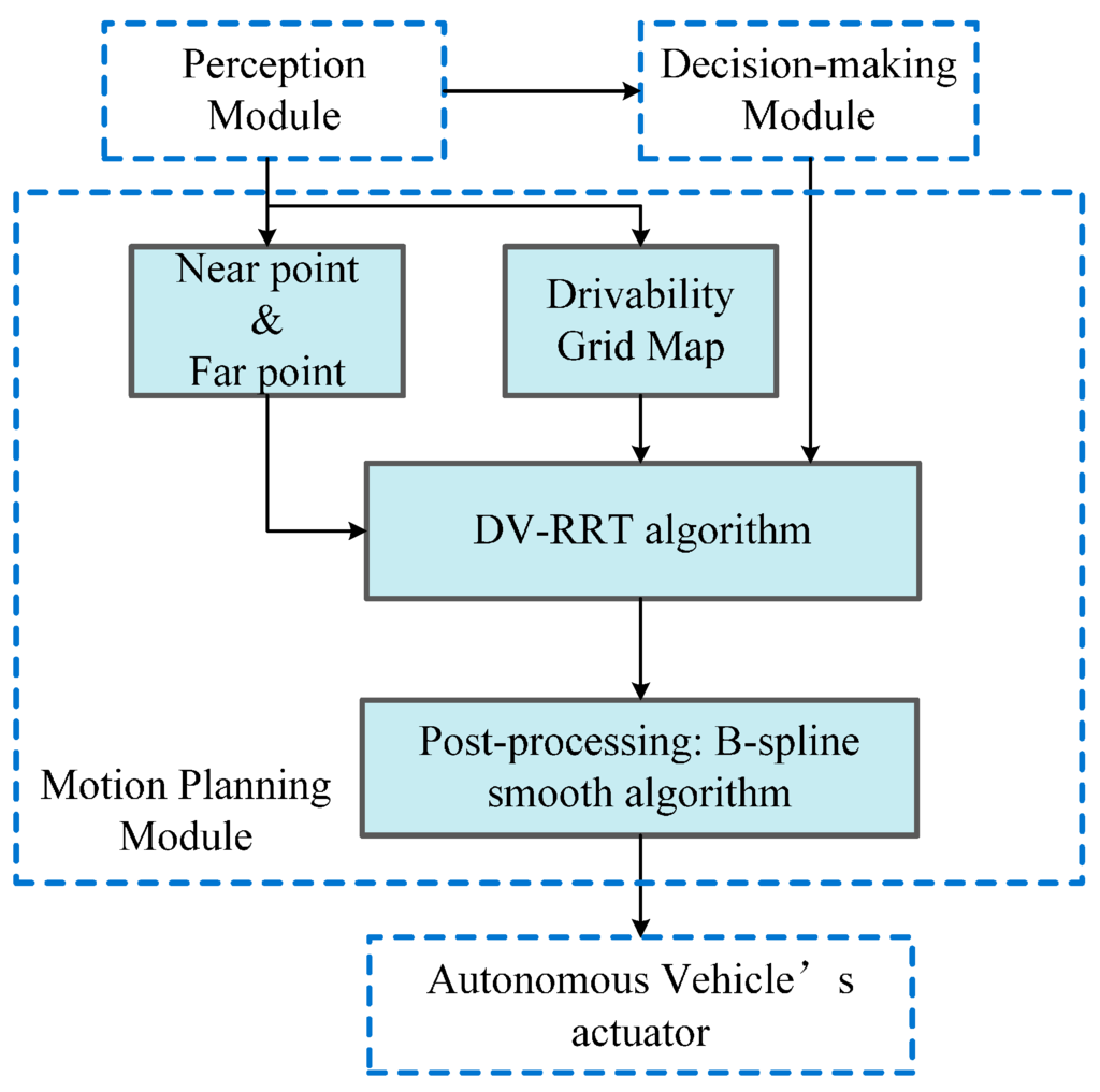 The complete structure of our approach is illustrated in Figure 5. Our approach is developed for the motion planning module of autonomous on-road driving, which receives the environmental information (i.e., Drivability Grid Map, which is described in detail in Section 4.1) and the needed salient points (“near” and “far” points) data from the perception module and the driving maneuver from the decision-making module. The output of our approach is a smooth and executable trajectory, which is converted to a feasible control sequence. Then, the sequence is sent to the vehicle’s actuator. The core of this approach is a RRT variant named DV-RRT algorithm. Based on our preliminary work, this algorithm introduces effective hybrid sampling strategies (detailed in Section 3.3) according to drivers’ visual search behavior. Moreover, a reasonable metric function of nodes connection (detailed in Section 3.4) and a B-spline based post-processing method (detailed in Section 3.5) are employed for further smoothen the trajectory, thus guaranteeing the feasibility of the trajectory.