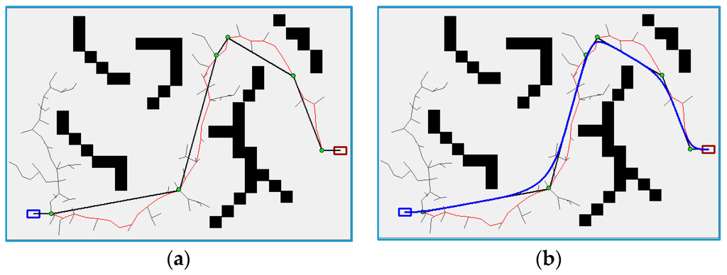 Simulation illustration of post-processing method: (a) RRT-based searching path and the corresponding pruning path and (b) smoothing path.