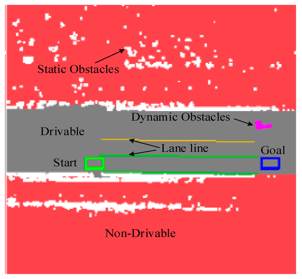 To enable the motion planning to interface with the perceived environment [35], the perception data, which includes non-drivable and drivable regions and the static and dynamic obstacles, are rendered into a Drivability Grid Map, as shown in Figure 8. The red part represents the non-drivable region, which are off-limited to the vehicle. The white part indicates the static obstacles, whereas the magenta part indicates the dynamic obstacles. The green rectangle is the current position of vehicle, and the blue rectangle, obtained from the “far” point of drivers’ visual behavior, is the short-term local goal location.