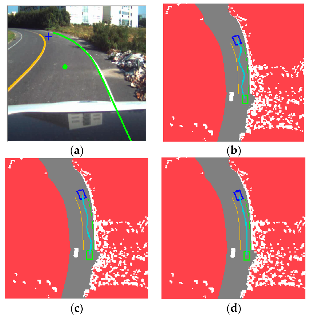 Driving on a straight road without obstacles is the most common traffic scenario. Figure 9a displays the result of the extracted “near” point (shown with green circle) and “far” point (shown with blue cross) according to the drivers’ visual search behavior on a straight road. Figure 9b presents the planning result of the basic RRT algorithm, which obviously generates a number of unnecessary turns. Figure 9c indicates the result of Bi-RRT. Although the unnecessary turns is relative less, the trajectory is exceedingly close to the road boundary. The result of the proposed approach is illustrated in Figure 9d. On a straight road, DV-RRT can plan a trajectory that is almost a straight line, enabling the intelligent vehicle to travel safely (see Figure 9d). Note that the planning trajectory of each approach is shown with the cyan line in Figure 9.