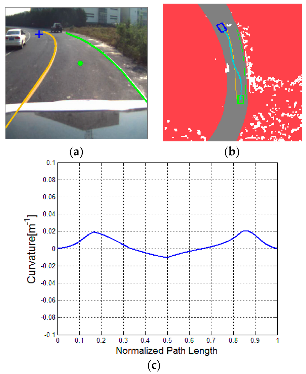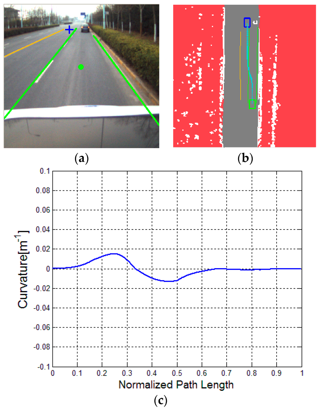 However, our method has several limitations. In certain structured environments, such as an urban environment, the proposed method can easily accomplish the motion planning with the guidance of clear lane mark and obvious road boundary. With no reliable road boundary and no clear lane mark, however, this method cannot obtain a good result because of the lack of the accurate guidance information. Therefore, for these unstructured environments, such as rural and field roads, we intend to utilize the visual image information from prior vehicle tire tracks and pedestrian footsteps to guide the motion planning. Considering the guidance nature of the drivers’ visual search behavior, it is believed that the proposed algorithm can also be applied to unstructured roads in the near future.