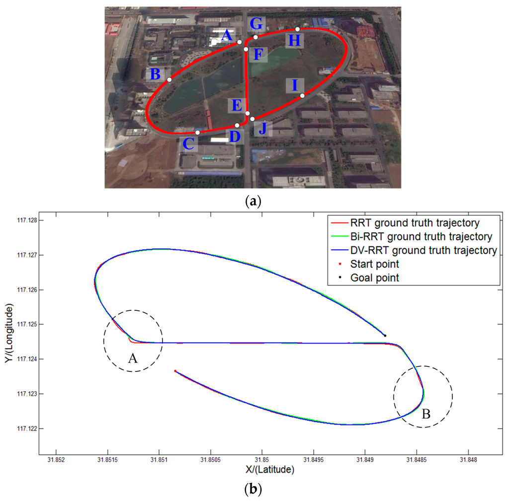 Figure 14 illustrates the ground truth trajectories of “Intelligent Pioneer II” recorded during a comparative test. Although the three different approaches can achieve the test route, their actual navigation performance have obvious differences. Figure 14a represents the well-defined route and the related way points. The comparison result of the three different methods is shown in Figure 14b. Figure 14c,d are the enlarged illustrations of A and B areas, respectively. The ground truth trajectory of DV-RRT (blue line)is smooth and reasonable (see Figure 14c,d). However, the ground truth trajectories of RRT (red line) and Bi-RRT(green line) always contain numerous unnecessary turns, especially on curved roads (e.g., A and B areas). The outdoor comparative experiment further validates the proposed approach.