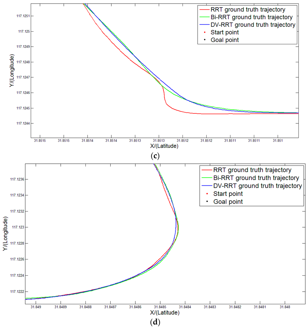 Comparison among different algorithms on a curved road: (a) experimental scenario; (b) result of basic RRT; (c) result of Bi-RRT; and (d) result of DV-RRT algorithm.