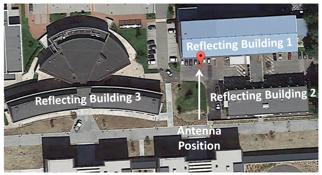 In order to validate the proposed approach and to analyze the efficiency of the synergy between the implemented RAIM algorithm and the GPS/Galileo multi-constellation solution, static data have been used. The data were collected in the Joint Research Centre (JRC) site in Ispra, Italy. More than two hours of 1-Hz data were collected using a multi-constellation, multi-frequency receiver. The receiver was placed in a parking area between three high buildings, which reflect GNSS signals and cause severe multipath errors in the GNSS measurements. In Figure 1, the environment where the antenna was placed is shown: GNSS signals can be degraded by multipath due to the buildings surrounding the receiver. This type of environment was selected in order to demonstrate the capability of the algorithm to identify and reject multiple outliers.