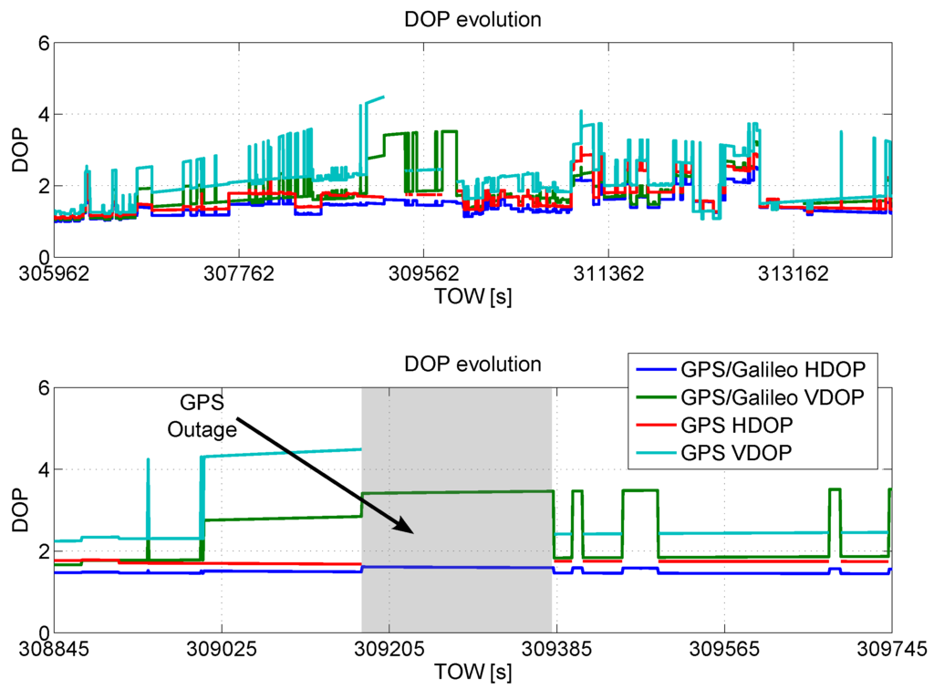 In Figure 2, horizontal dilution of precision (HDOP) and vertical dilution of precision (VDOP) of the configurations without RAIM application are plotted as a function of time; from the figure, it emerges that the geometry conditions during the data collection were not so critical. In fact, the HDOP reaches a maximum value of  and  for GPS/Galileo and for GPS only, respectively. Only a short outage is present using only GPS, as detailed in the lower box of Figure 2. The inclusion of the Galileo measurements reduces both HDOP and VDOP, and no outages are present in the case of the multi-constellation solution.