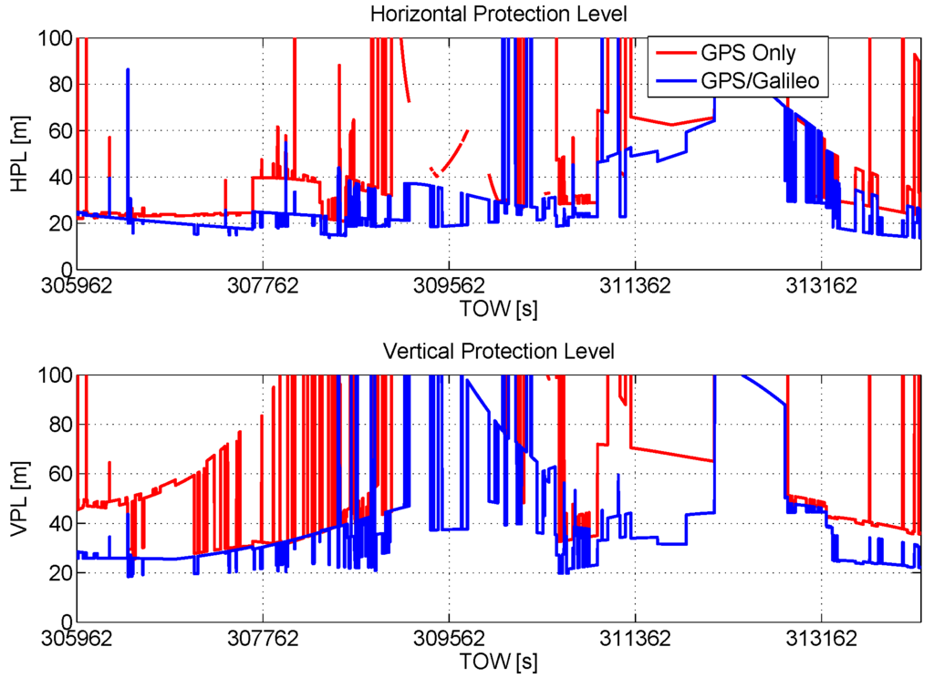 Two of the outputs of the RAIM algorithm are the horizontal protection limit (HPL) and vertical protection limit (VPL) defined in []. In order to demonstrate the benefits of Galileo inclusion, HPL and VPL are plotted as a function of time in the upper and lower boxes of Figure 3. The improvements due to the Galileo inclusion clearly emerge from Figure 3: both HPL and VPL are lower than in the GPS-only case.