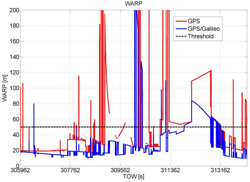 In Figure 4, the WARP values are plotted as a function of time and with respect to the threshold, . The benefits of the introduction of the Galileo observables are evident as for the HPL and VPL cases.