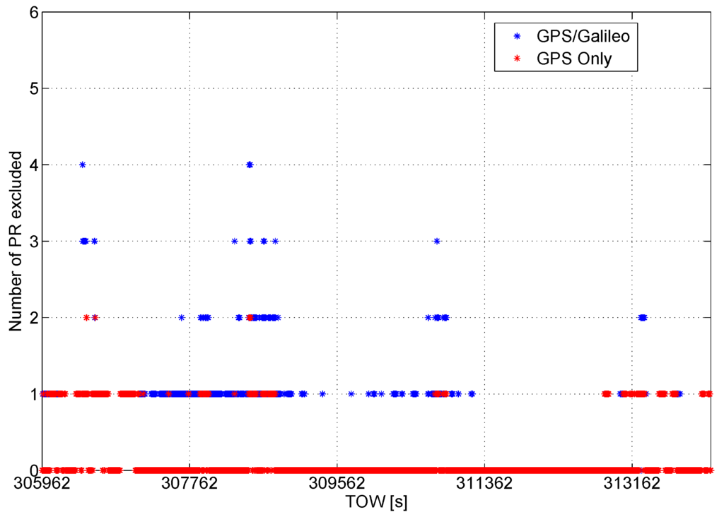 The introduction of the Galileo measurements provides an enhancement of the redundancy of the system; this is a key enabler for the improvements of the performance of the RAIM algorithm. The enhanced redundancy allows the rejection of a higher number of measurements affected by gross errors. The number of pseudoranges excluded epoch by epoch is shown in Figure 5: in the multi-constellation, case a higher number of outliers can be identified and rejected.