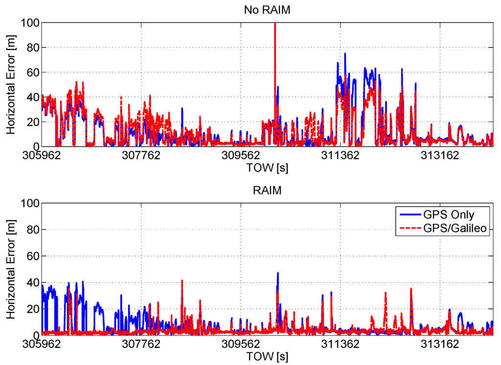 From the analysis, it emerges that GPS alone is not able to provide accurate and continuous navigation in signal-degraded environments. Although the introduction of RAIM improves the performance of GPS-only navigation, the solution availability is significantly reduced. This availability reduction is compensated by the inclusion of Galileo measurements, which enhance performance with respect to the baseline configuration. The inclusion of Galileo measurements alone may not be sufficient for achieving the required level of performance, since also the multi-constellation solution is characterized by large errors. The joint adoption of Galileo and RAIM improves performance with respect to the baseline configurations for all of the considered parameters: horizontal error parameters are more than halved with respect to configurations without RAIM. Furthermore, the vertical errors are significantly reduced.