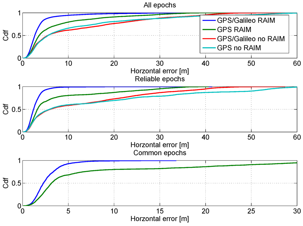 The CDFs of the horizontal errors obtained in the two cases are plotted in Figure 21. As for the previous cases, the CDFs considering all available epochs is shown in the upper box of the figure; in the central box, the performance of the considered configurations is obtained considering only reliable epochs. Finally, in the lower box, the CDFs are computed using only reliable common reliable epochs. In all cases, the advantages of the tests introduced can be clearly appreciated: the blue lines are higher than the green ones.