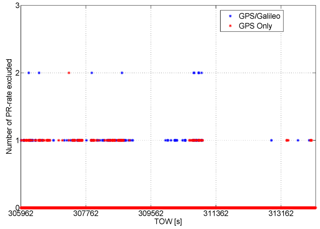 The number of pseudorange-rate measurements excluded from the navigation solution is plotted as a function of time in Figure 16: the number of exclusions is lower than in the pseudorange case; however, also in this case, the introduction of the Galileo measurements improves the redundancy of the system, enhancing the performance of the RAIM algorithm, which is able to reject a higher number of observables.