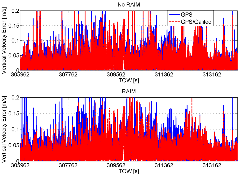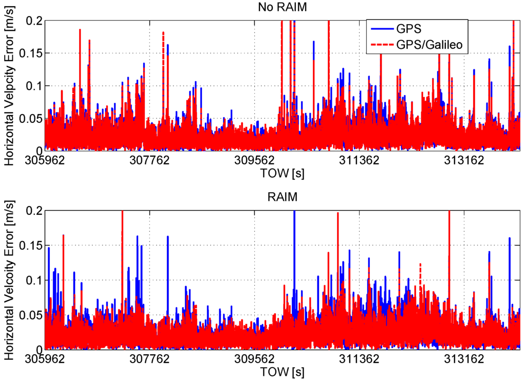 Statistical error parameters are computed using only reliable epochs in Table 8: the main advantage of RAIM application is the reduction of the maximum errors in both the horizontal and vertical channel. The maximum horizontal velocity error passes from  m/s, in the GPS-only case without RAIM, to  m/s applying the RAIM algorithm. The improvements in the multi-constellation case are even more evident: the maximum error is reduced almost six times, passing from  m/s to  m/s.