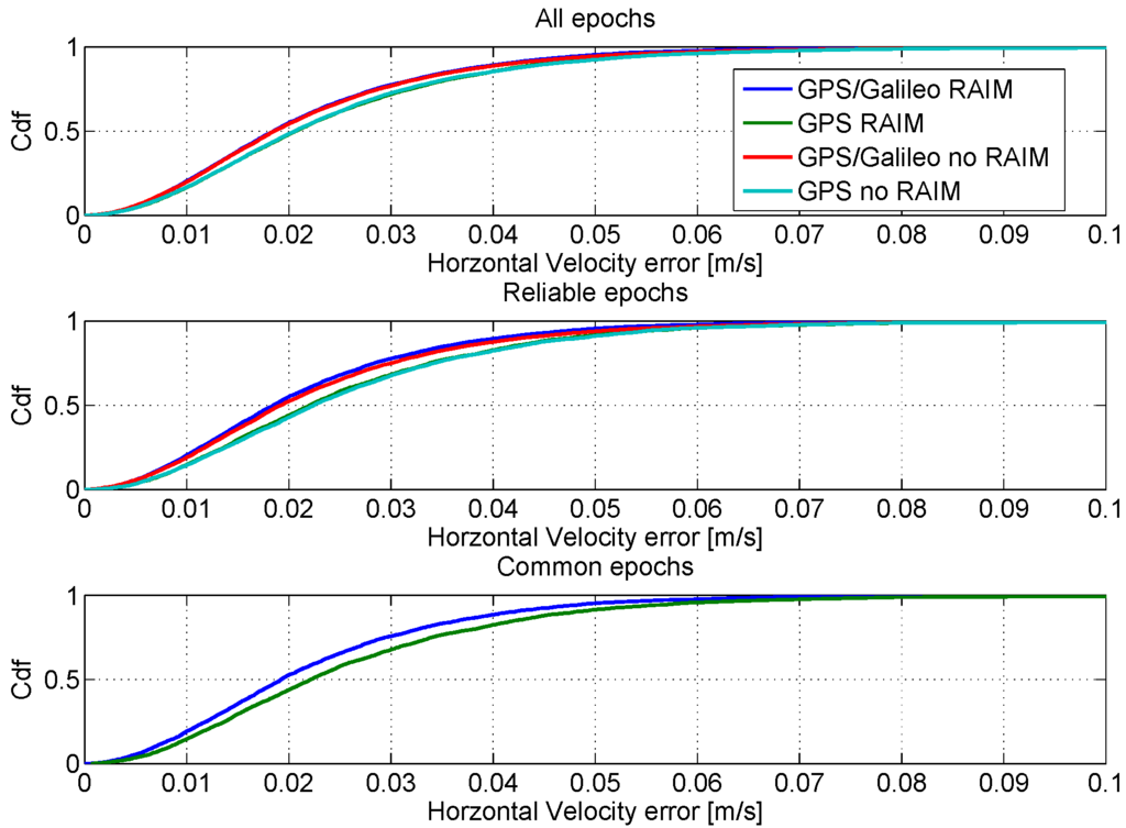 In order to have a fair comparison among the considered configurations, the CDFs of the horizontal and vertical velocity errors are shown in Figure 19 and Figure 20, respectively. As for the position domain, three different time frames have been identified and used to compute the CDFs. In particular, the CDFs computed using all of the available epochs are shown in the upper boxes of the figures. In the central boxes, the CDFs using only reliable epochs are shown, and finally, in the lower boxes, the CDFs using only the common reliable epochs are provided. The figures show that all of the configurations have similar performance in the velocity domain: only a slight improvement can be appreciated using the GPS/Galileo multi-constellation solution together with the application of the RAIM algorithm.