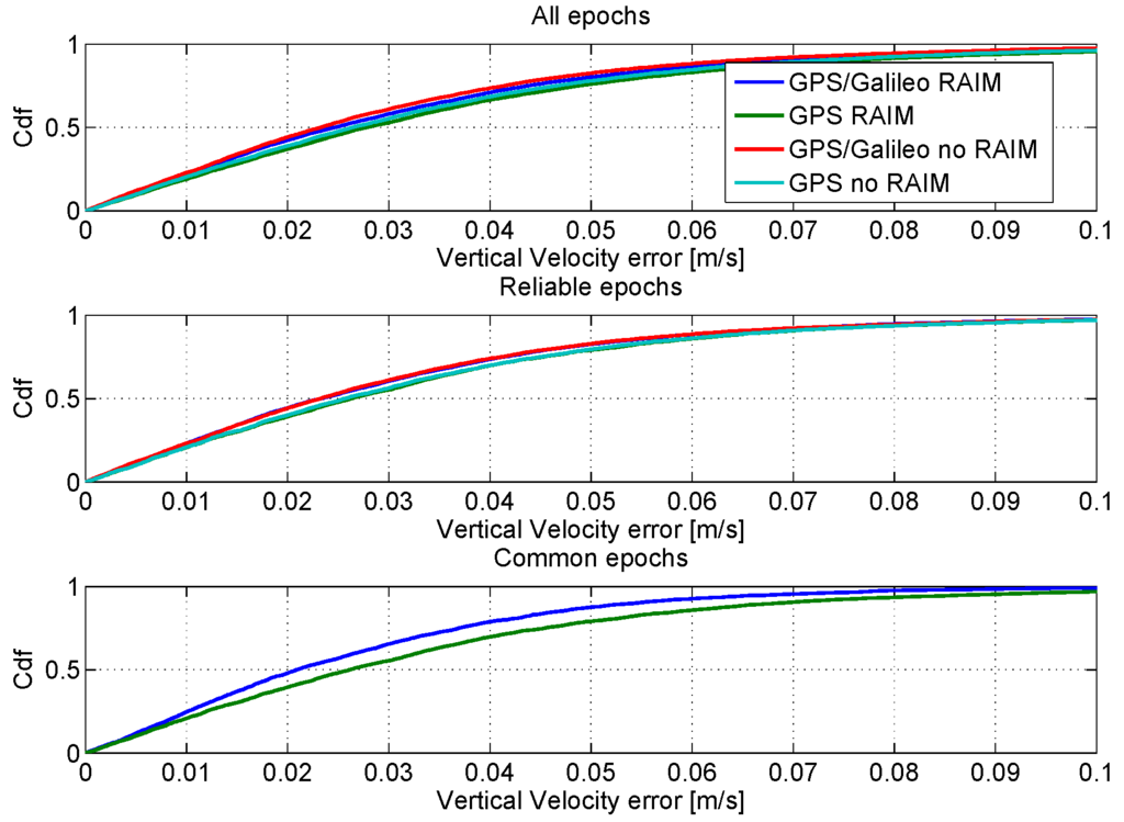 In the velocity domain, the benefits of the Galileo inclusion are less evident: the combined use of Galileo observables and RAIM algorithms improves the performance mainly in terms of maximum errors, which are strongly reduced in both horizontal and vertical components.