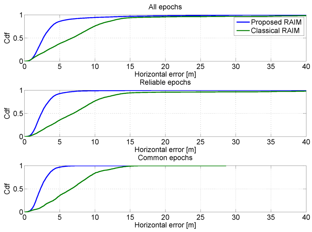 The benefits of the proposed algorithm clearly emerge from the tables. When all epochs are considered, the proposed algorithm provides improved performance with respect to the classical RAIM algorithm. The improvements are evident for all of the considered parameters, i.e., the maximum and mean error and the error SD. The improvement is present for both horizontal and vertical components. When only reliable epochs are considered, the classical RAIM algorithm provides better performance in terms of maximum horizontal and vertical errors. However, in this case, the performance of the two configurations is evaluated considering different epochs, because the algorithm provides different RA, which in the case of the classical algorithm is  ( was obtained with the approach proposed). The classical RAIM approach is more conservative and does not foresee the possibility of having multiple exclusions. In order to perform a fair comparison between the considered configurations, the performance is evaluated considering only common reliable epochs in Table 12: the proposed algorithm reduces all of the statistical error parameters considered.