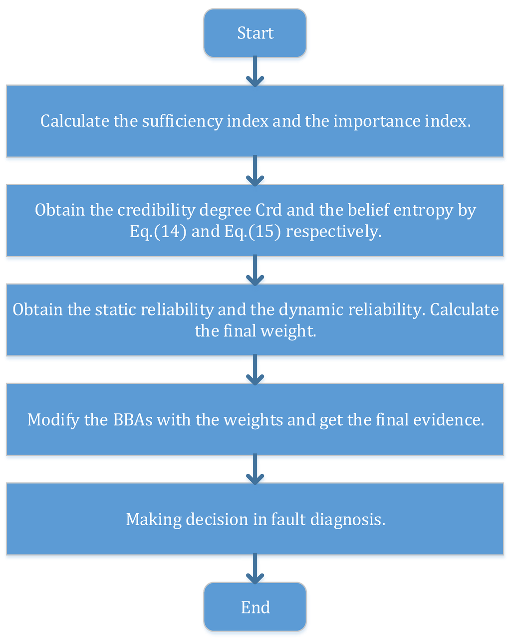 Use the value to make weighted averaging according to Equation (13), and the weighted evidence can be obtained. Combine the weighted evidence  times, and the fusion result can be obtained to make the final decision. To illustrate the process more clearly, Figure 1 shows the flowchart of the new method specifically.