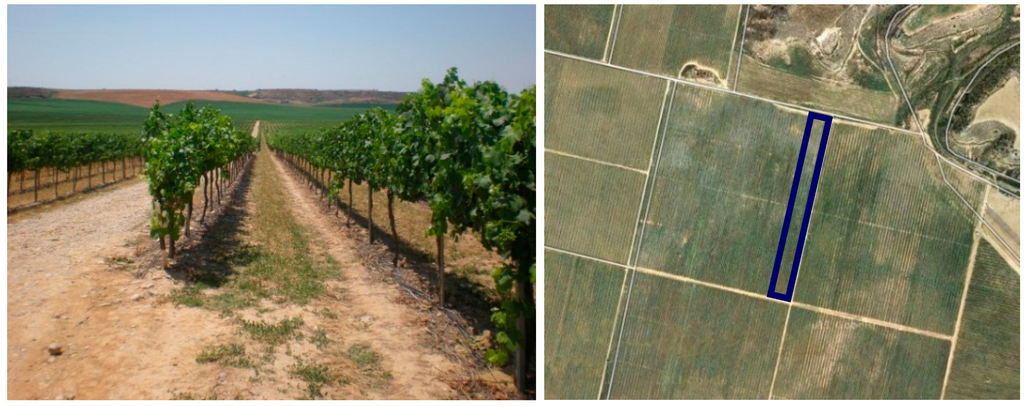 A vineyard plot with contrasting vigor was chosen for the field test (Figure 1). The vineyard was located in Raimat (Catalonia, Spain), and was planted in 2002 with the cultivar Vitis vinifera L. cv. Syrah. The six rows of the plot where the trial was conducted were oriented north-south, covering a total length of 360 m (approximately 0.70 ha). The vines were trained in vertical shoot position, and were watered by partial rootzone drying. The test was performed at growth stage 79 (majority of berries touching) according to the Biologische Bundesanstalt, Bundessortenamt und CHemische Industrie (BBCH)-Scale [30]. The vines were less vigorous at the northern, highest part of the plot, and more vigorous at the southern area at lower elevation. Given the highly structured spatial distribution of vigor, the plot was very suitable to assess MTLS for detecting the variability of the vineyard. Soils in these fields were classified as Typic Haploxerepts and Fluventic Haploxerepts [31]. The Typic Haploxerepts, located in the highest part of the plot, presented a paralithic contact within the first 50 cm, which could be the main reason for the differences in vigor detected in the plot.