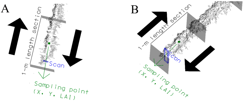 1-m long section of the row including scans obtained from both sides of the row. (A) and (B) are views of the same scene from different perspective. The LAI estimation is assigned to the sampling point.
