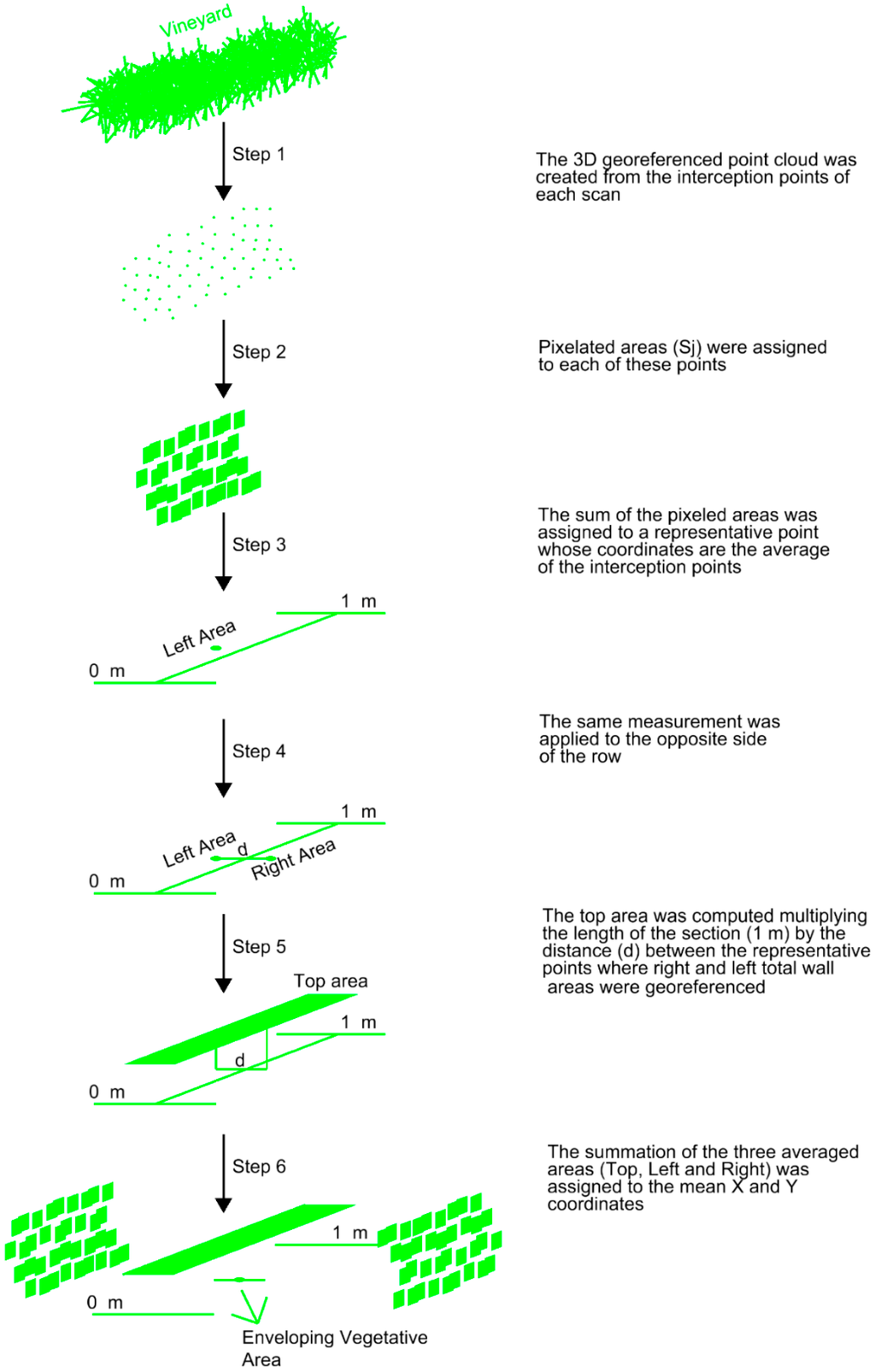 As a result, the total leaf wall area from one side of the row was computed as the sum of the pixelated areas of each scan and georeferenced at the average coordinates of the scans in 1-m length section. The same was repeated for the opposite side of the row. The ultimate goal was to obtain the so-called enveloping vegetative area of the canopy, consisting of the sum of the two leaf wall areas (excluding gaps) and the area that encloses the top of the row. The top area was computed considering the distance between the points where the right and left leaf wall areas were georeferenced. The training system of the plot allows for an important canopy development in width. This parameter should be taken into account since it represents a large leaf area. The inclusion of row width data is the main difference to previous work in this respect [8]. Figure 5 shows the different steps of the process. LAI was then calculated using the following expression: