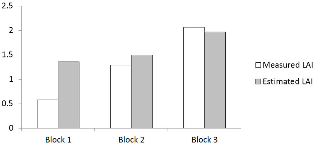 Measured and estimated LAI in three different contrasting vineyard blocks.