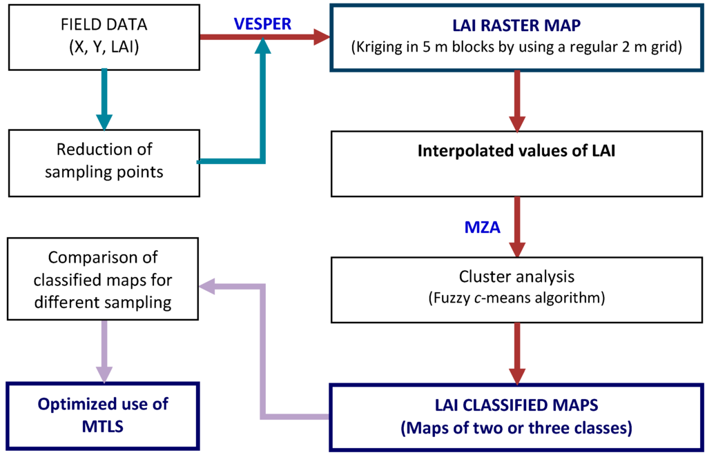 The main objective of this study was to develop a methodology that allows the use of mobile terrestrial laser scanners (MTLS) in viticulture to estimate and map the LAI. The laser scanner used in this work has been previously designed and validated for use in tree crops [8]. There are two issues covered in this study. The first is the method adopted to process the data. The second is to optimize the use of MTLS in field conditions by replacing the on-the-go scanning along the rows by discontinuous, and more affordable, scanning at only certain sampling points.