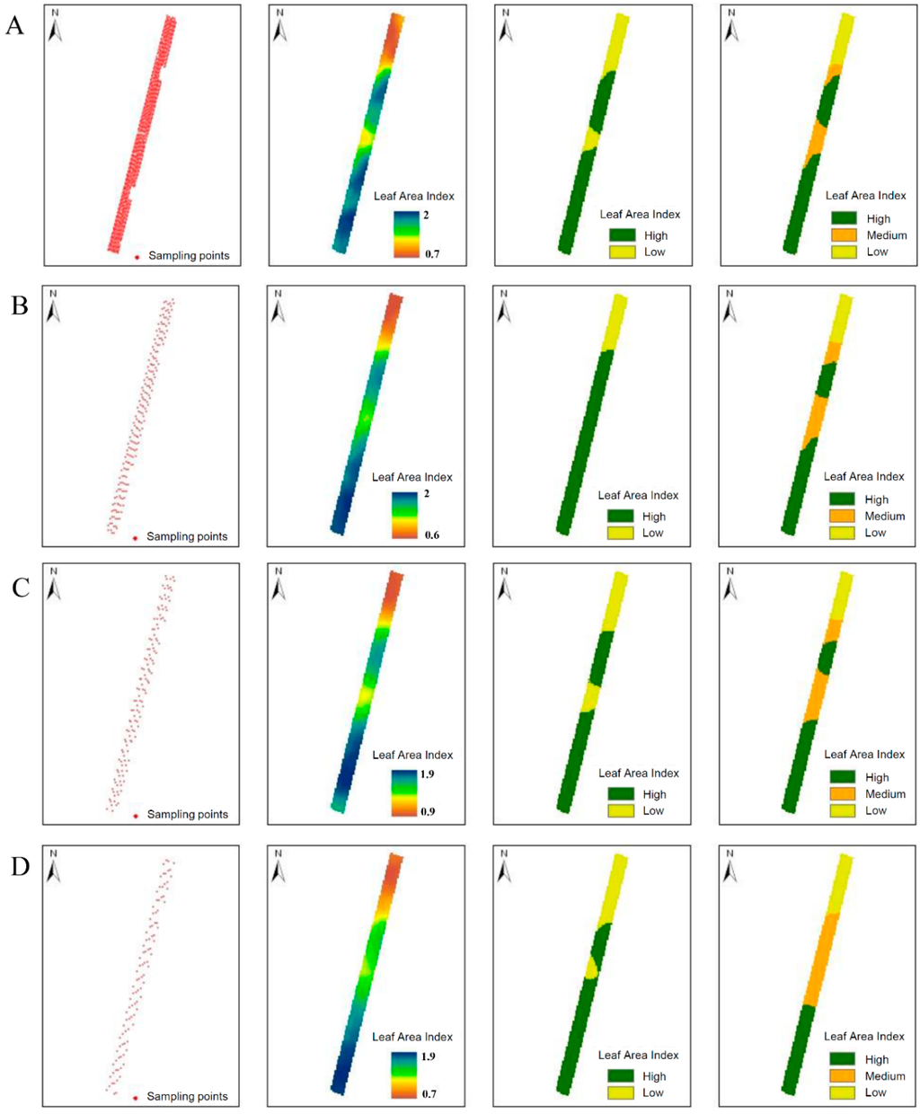 Sampling points, LAI raster maps, and LAI classified maps for different MTLS sampling schemes along the rows. The sampling sections are separated 1 m (A); 10 m (B); 15 m (C); and 20 m (D).
