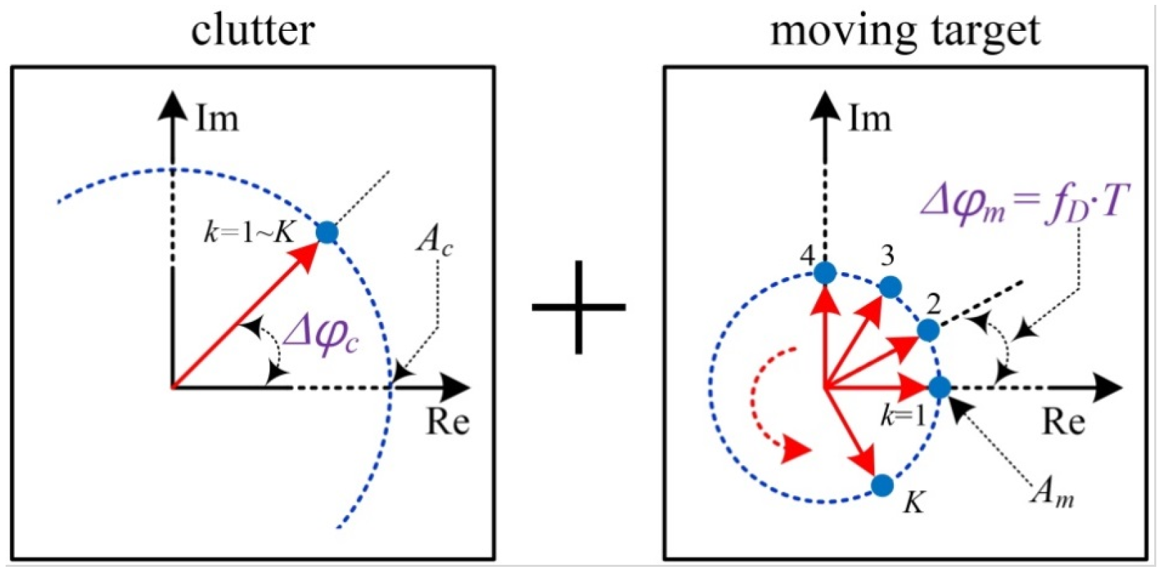 are proportional to each other. The rotation of the complex vector with increasing phase is caused by the radial velocity of target. In