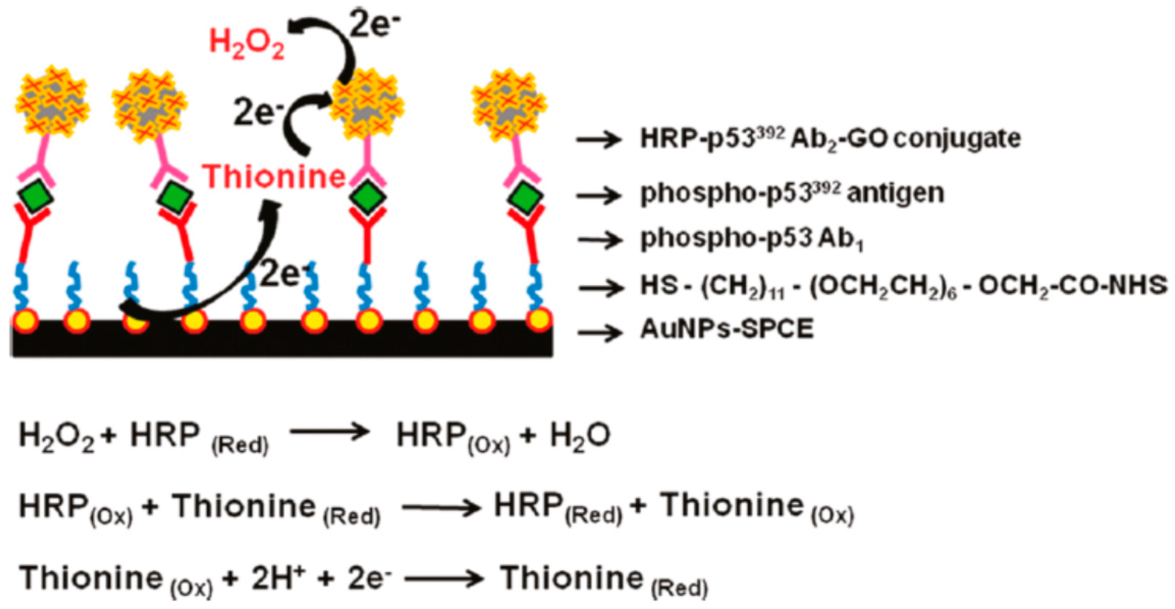 - Xie, Y.Y.; Chen, A.G.; Du, D.; Lin, Y.H. Graphene-based immunosensor for electrochemical quantification of phosphorylated p53 (s15). Anal. Chim. Acta 2011, 699, 44–48. [Google Scholar] [CrossRef] [PubMed]